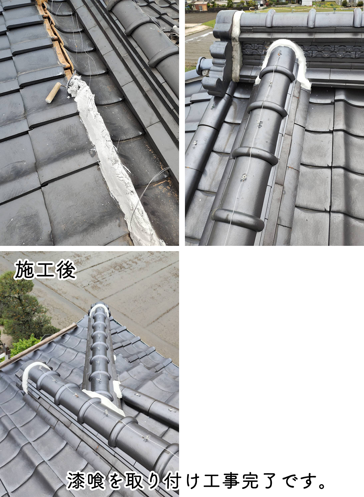 今回、お客さんから2度と壊れないように施工して欲しいとご依頼を受けて、石州防災熨斗工法で施工させて頂きました。