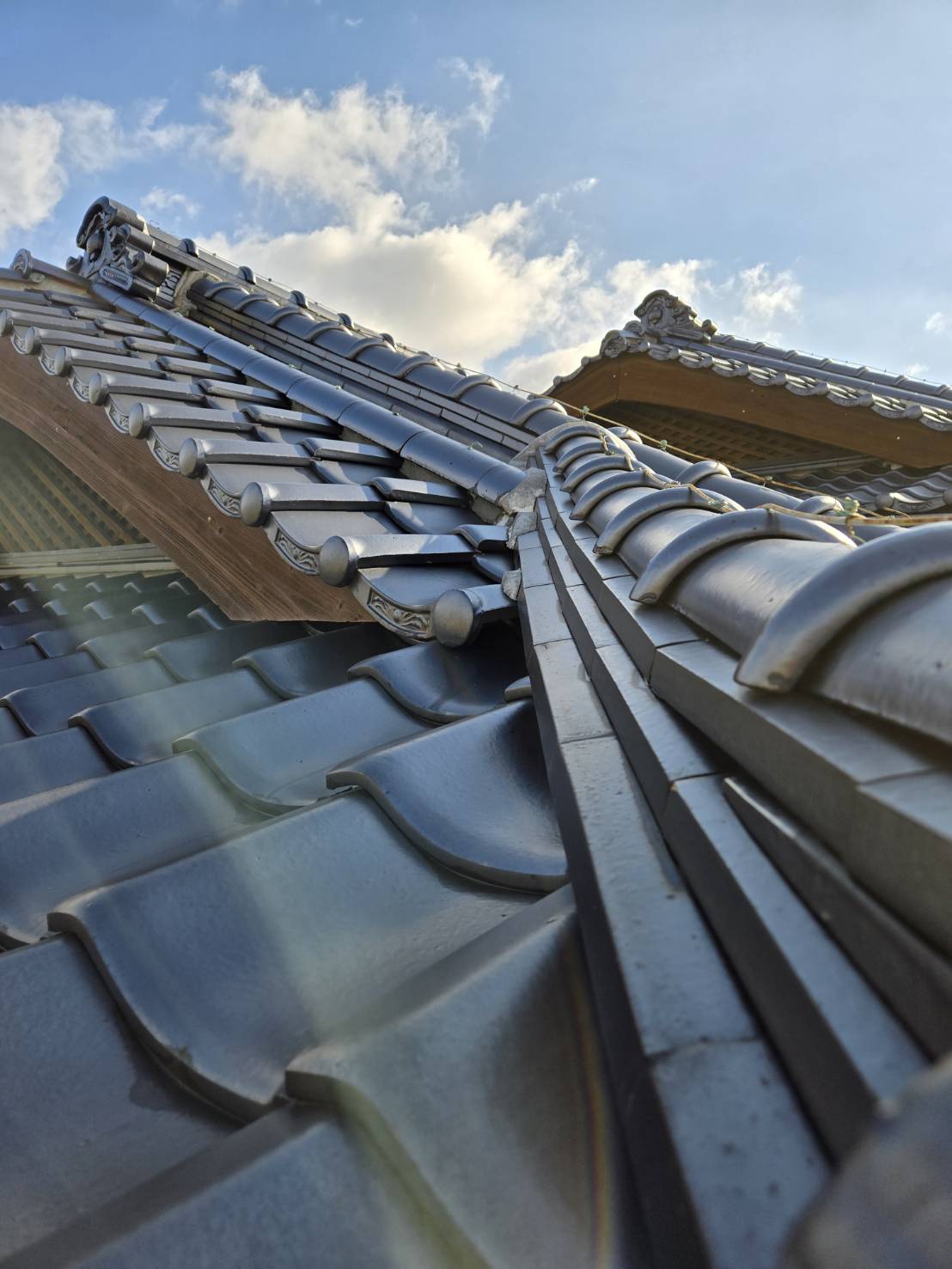 泥葺き部分の錆びて穴が空いてる陸谷を入れ替える工事をし、一部分新規石州瓦で葺き替え工事を行いました。